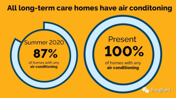 4月1日,省府更新《长期护理院法案》(Long-Term Care Homes Act, 2007)之监管条例。此次调整,不仅强制要求所有长期护理院为指定避暑区域配备空调,还加强了执法有效力度。上述新规定,已于2021年5月15日生效。目前,全省共有626 家长期护理院,全部都配有空调。相较之下,去年有近13%长期护理院未配有空调。