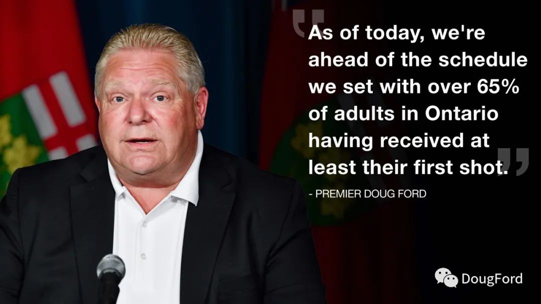 安省福特省长5月28日记者会上指出:“省政府已达成重要抗疫里程碑,提前完成为65%满18岁人群接种第一剂疫苗的目标。同时,省府将加速第二剂接种速度,决定自2021年5月31日开始,先为满80岁人群接种。如果疫苗供应充足,省府将在夏天结束前为大多数民众接种两剂疫苗。”