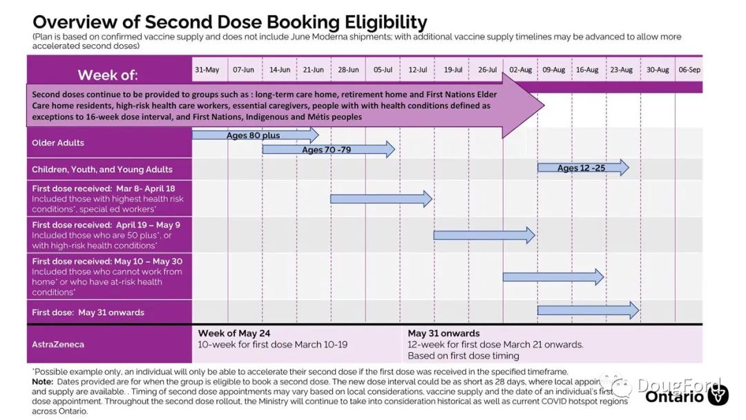 为实现该计划,安省政府已经制定预期时间表,说明何时可以接种第二剂疫苗。省府预计于2021年5月31日8时开始,先向2021年内满80岁人群开放预约资格,并于2021年6月14日向满70岁人群开放预约。之后,省府将继续根据第一剂接种时间,为更多人群开放预约第二剂资格。只要联邦政府确定疫苗到货量增加,省府便将进一步加快第二剂接种步伐。