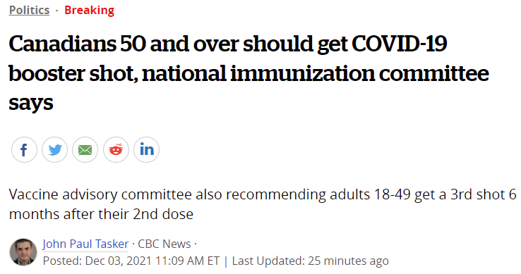 12月3日,加拿大国家免疫咨询委员会(NACI)在一份报告中,“强烈建议”(strongly recommend)所有50岁以上的加拿大人,和其他高风险群体,比如医疗工作者、原住民和护理院居民,前去接种第三剂mRNA新冠疫苗。