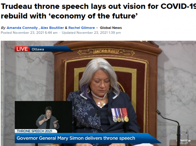 11月23日,加拿大总理贾斯廷·特鲁多就施政报告(Speech from the Throne)发表如下声明: