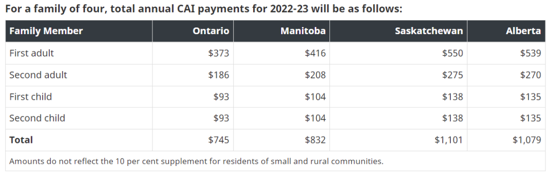 对于四口之家来说,安省的补贴将达到$745元,曼省为$832元,萨温省为$1101元,阿省为$1079元。
