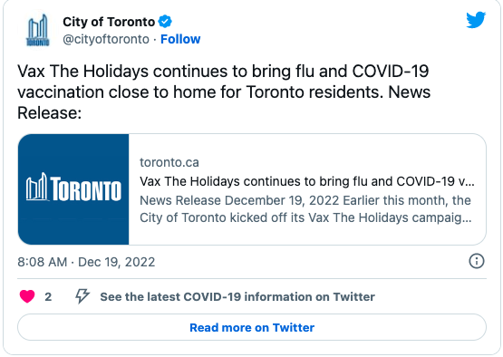 加中资讯网2022年12月21日讯 随着圣诞节和新年假期临近,多伦多市政府工作人员再次呼吁民众接种COVID-19加强剂和流感疫苗。