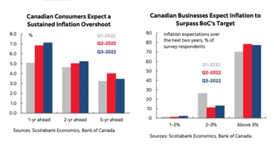 在16日公布的商务展望调查还就另外两个重要参考标准——通胀预期和薪资计划,提供更多信息。之前的调查版本显示,消费者和商家并不认为通胀会在中期内冷却到央行的目标范畴,Scotiabank的经济学家Derek Holt表示。