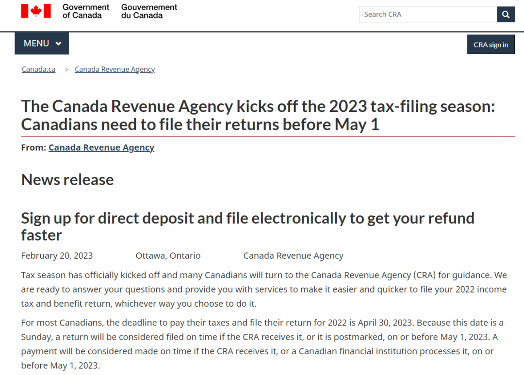 对于大多数加拿大人来说,2022年缴税和报税的最后期限是2023年4月30日。由于这一天是周日,如果CRA在2023年5月1日或之前收到,或以邮戳为准,将被视为按时报税。