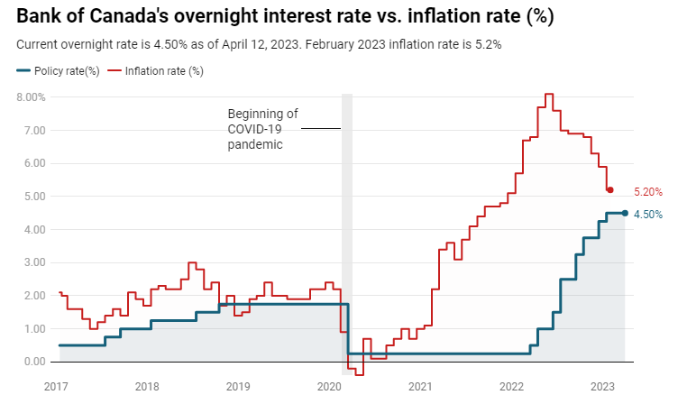 加中资讯网2023年4月13日讯 加拿大央行在本周三的议息会议上宣布,将政策利率维持在4.5%。加央行仍然相信通货膨胀率将从2月份的 5.2%继续下降到今年年中的3%。然而加央行同时承认,他们要在2024年将通货膨胀率恢复到2%的目标将更具挑战性。