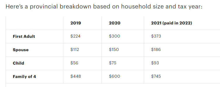 以安省为例,个人为$373元,配偶或同居伴侣$186元,每名19岁以下儿童$93元,单亲家庭的第1名儿童$186元。这样,一个四口之家可获发的金额是$373+$186+$93+$93=$745元。按季度发放,第季为$186.25元,第一笔含前两个季度,为$372.5元。