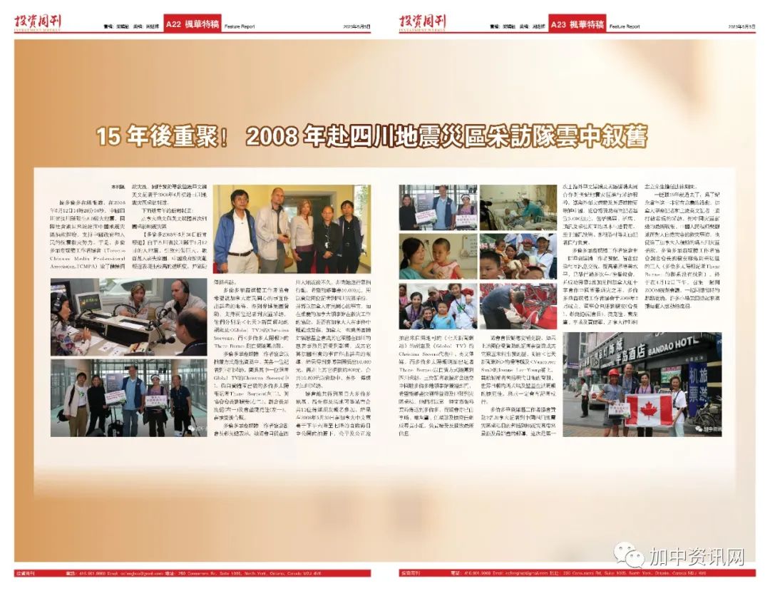 加中资讯网2023年5月5日讯 据多伦多在线报道,在2008年5月12日14时28分04秒, 中国四川省汶川县发生8.0级大地震,国际社会连日来纷纷向中国地震灾区捐款捐物,支持中国政府和人民的抗震救灾努力。于是,多伦多华裔媒体工作者协会(Toronto Chinese Media Professional Association,TCMPA)除了积极捐款灾区,同时发动筹款组织华文与英文记者于2008年6月初赴四川地震灾区采访报道。