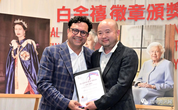在7月19日于安省列治文山市举行的颁奖典礼上,公司执行董事Michael Zhang代表公司上台接受了由加拿大联邦国会议员⻢万里颁发的徽章和证书。他在获奖之后说,“非常高兴能荣获白金禧徽章这样一个含金量极高的褒奖!非常兴奋!这也是对我们整个集团员工对社区和加拿大社会继续奉献自己一份力量的极大鼓励。”