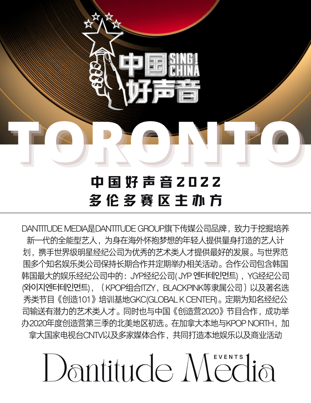 主办方Dantitude Media的创始人Shero Li介绍到:“我们这次是采用了线下直播结合线上直播的方式,在比赛的过程中,选手的亲友团可以通过线上投票的方式助力喜爱的选手。本次活动也将通过五场海选 - 半决赛 - 决赛的形式角逐出《2022中国好声音多伦多》冠亚季军并获得直通加拿大总决赛的机会。本次多伦多赛区将有比赛合作媒体录制优秀选手短片,制作《中国好声音海外选手成长记》养成类短片,助力你的梦想。更有转为好声音选手提供的专业艺人包装,培训等项目,打造新生代好歌手。”
