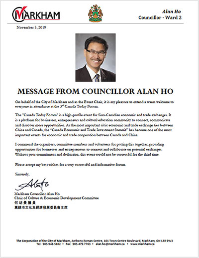 据申加实业公司董事长、“今日加拿大”总编董黎明先生介绍,第三届“今日加拿大论坛”将于2019年11月7日在中国上海举行,这是继2005年首届“今日加拿大论坛”、2018年第二届“今日加拿大论坛”成功举行以来,又一次加中两国经贸文化合作的最为重大的盛会。也是中国国际进口博览会期间,唯一被中方认可的最具规模、最具影响力的加中经贸文化交流活动。