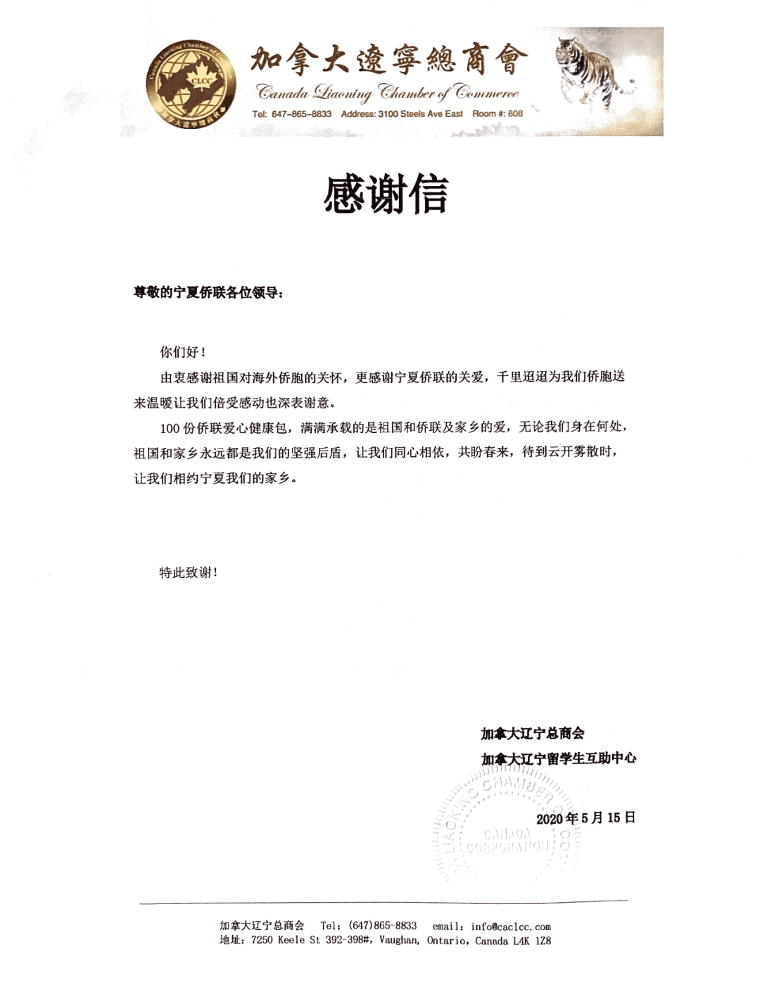 宁夏侨联及加拿大辽宁总商会宁夏办事处衷心希望海外侨胞和留学生们能够增强自信,加强自身防控,携手共抗疫情。