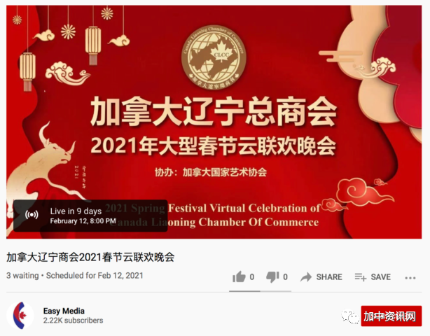 由于受疫情的影响,今年加拿大辽宁总商会2021年“云端”新春联欢晚会由轻松传媒EasyMedia策划执行,新春联欢晚会全程采用YouTube及国内抖音视频平台同步直播 。