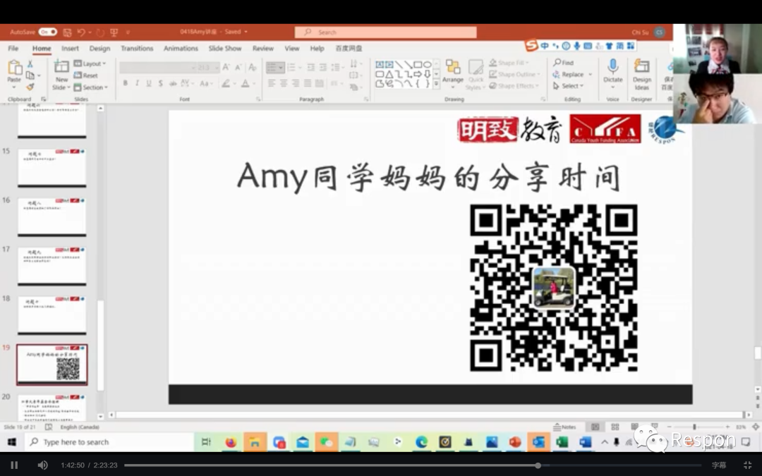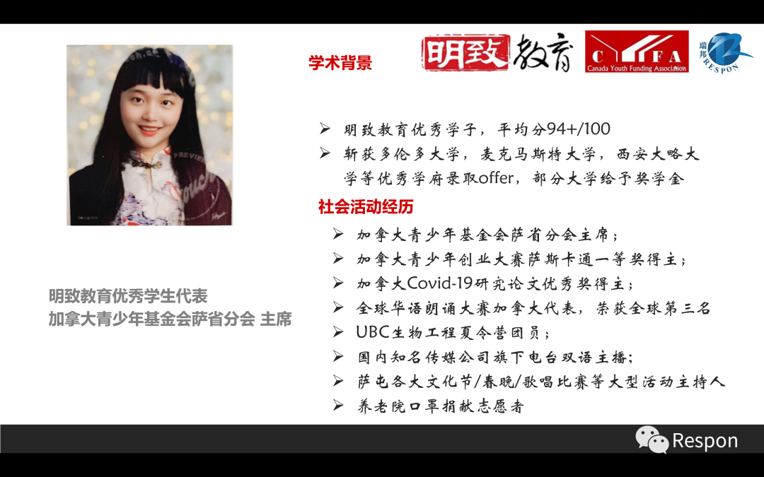 Amy同学学习成绩优秀,平均分为94+。作为加拿大青少年基金会主席,Amy带领团队夺得了青少年创业大赛萨斯卡通一等奖,曾经代表加拿大参加二十二个国家代表团的全球华语大赛,中国知名传媒公司旗下电台双语主播,Covid-19研究论文优秀奖得主,口罩捐献志愿者。学业和社会活动双丰收让Amy获得了来自阿尔伯塔大学 西安大略大学 麦克马斯特大学 多伦多大学等多所名校的录取通知书,部分大学给与奖学金。Amy妈妈也分享了教育孩子的经验,引起了家长的共鸣!