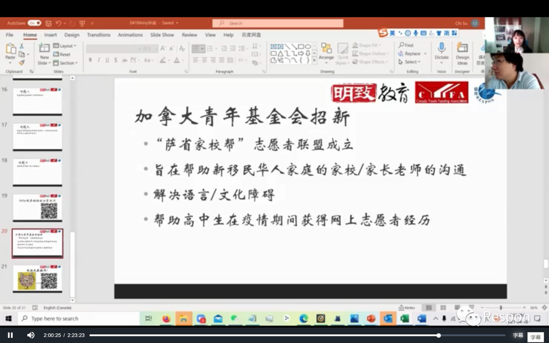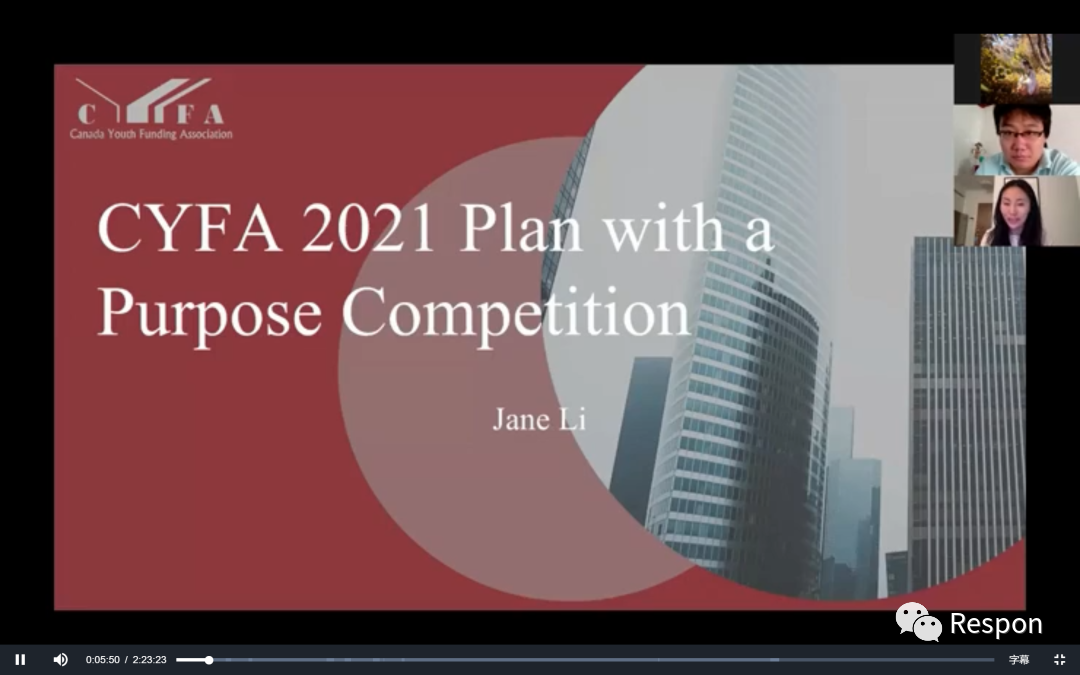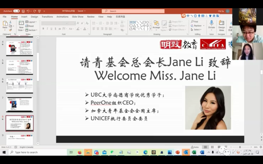 加拿大青少年基金会总会长Jane Li女士代表青基会致辞。作为UBC大学商德商学院的优秀毕业生,Jane讲解了即将举行的2021 CYFA商业大赛,希望更多的优秀学子参与本次商业大赛。