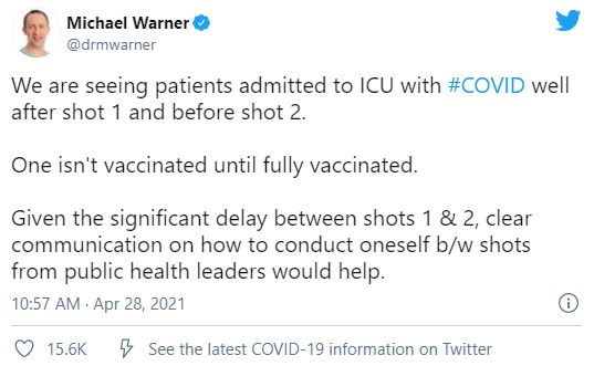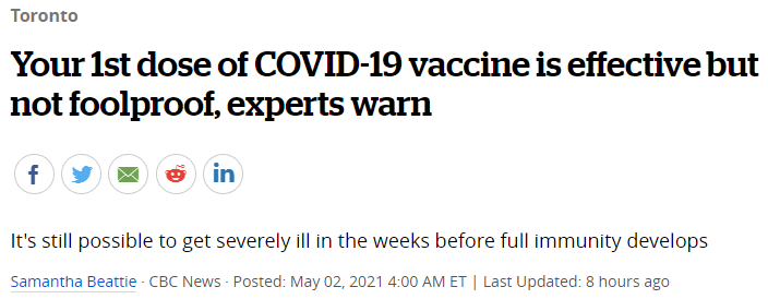多伦多Michael Garron Hospital的重症监护主任Dr. Michael Warner近日在推特上说:“我们看到有患者在接种了第一剂疫苗后,仍然入住了ICU。接种一剂疫苗并不是完全接种。”