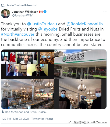 北温哥华区国会议员/环境及气候变化部长今天,我很荣幸能陪同贾斯廷·特鲁多总理在线访问了北温区的Ayoub's Dried Fruits & Nuts以及它的店主Amir Hosseini,一同探访的还有麦金农(Ron McKinnon)国会议员。在周末加拿大各地社区都在庆祝诺鲁孜节,而我们联邦政府正在竭力努力扶持复苏进程中的小企业,我很幸运能直接听到北温哥华区、碑诗省乃至全加各地的企业主的声音。