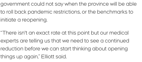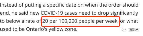 埃文斯说,新增病例需要大大降低到每100,000人每周新增低于20例的水平,或者安省颜色框架中的黄色区标准,而不是定下命令终止的具体日期。