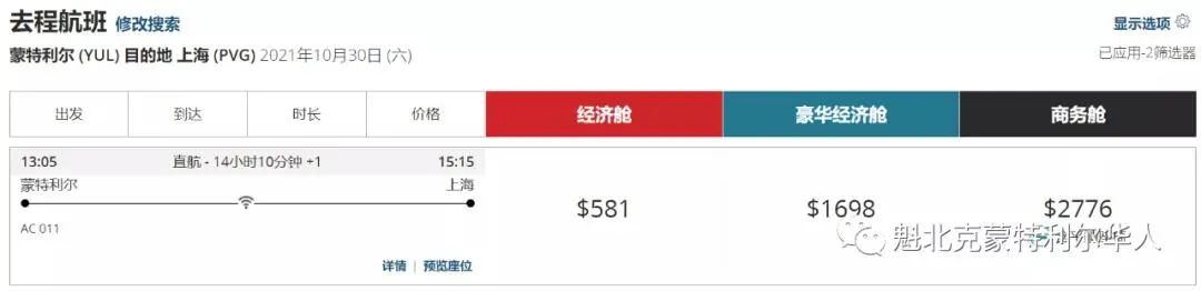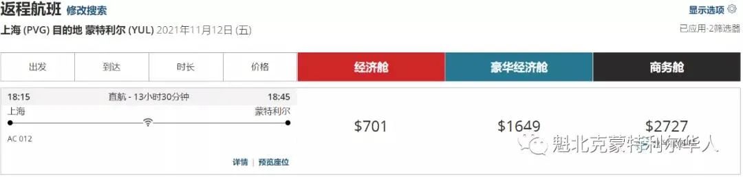 返程航班于上海时间18点15分起飞,飞行时间约13小时30分钟,到达蒙特利尔的时间是18点45分,返程航班代号AC012。