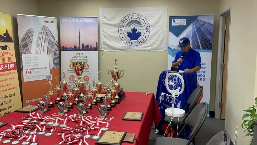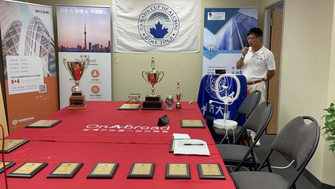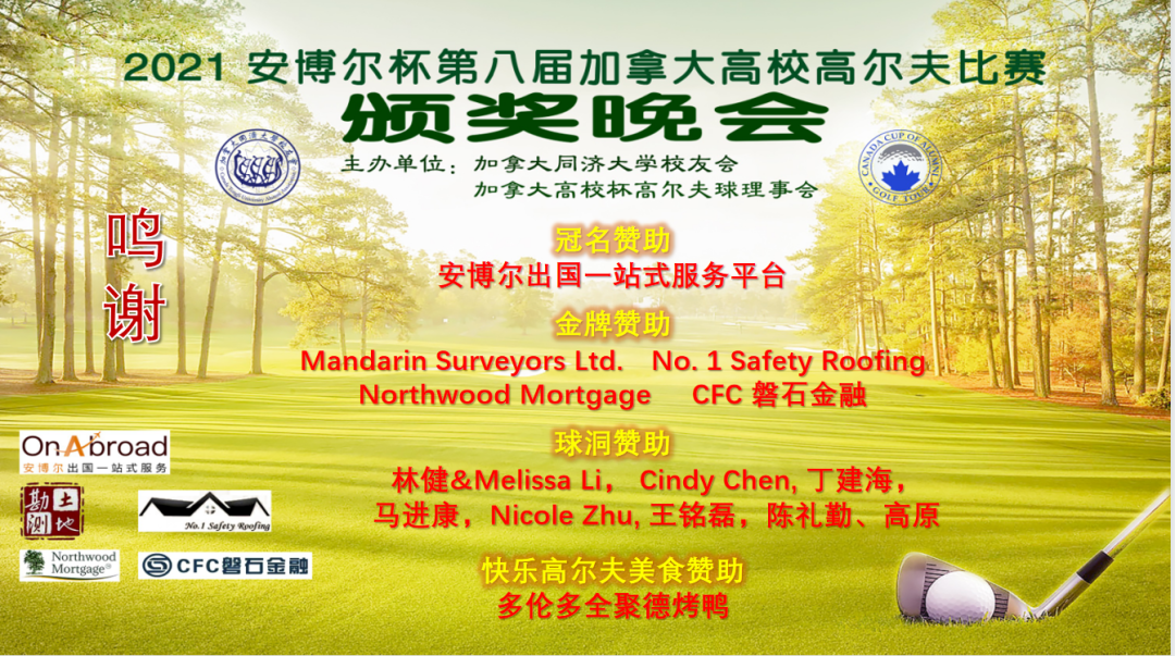 随后主持人Catherine Zhou 介绍本届赛事金牌赞助商:Mandarin Surveyors LTd,No.1 Safety Roofing,Northwood Mortgage 和 CFC 磐石金融以及球洞赞助:同济大学校友:林健&Melissa Li、 Cindy Chen、大鹏地产丁建海和马进康、Koman LLP地产律师行Nicole Zhu、上海大学校友王铭磊、安徽大学校友陈礼勤、西北大学校友高原以及全聚德烤鸭多伦多店,并表达了对以上各位赞助商的感激之情。