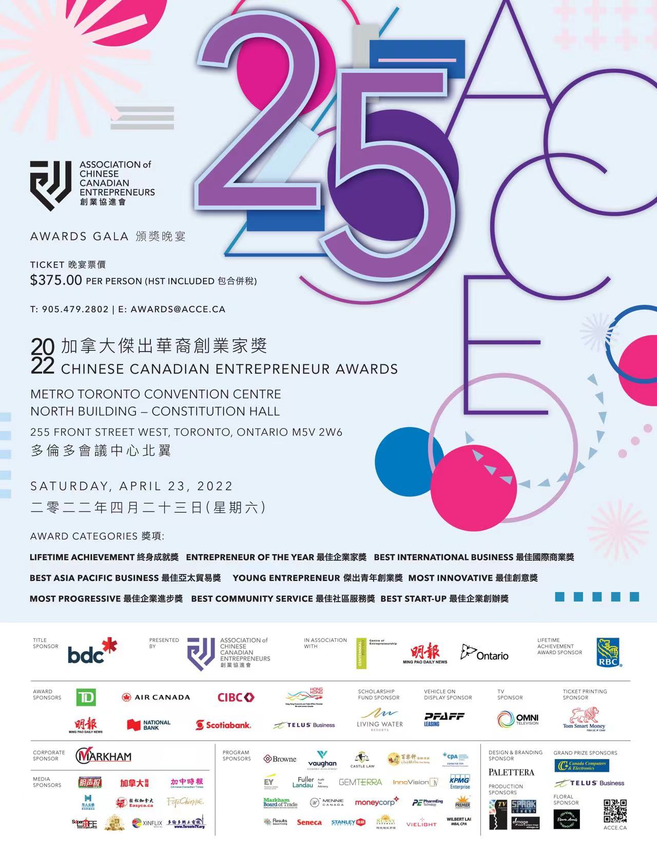 票务查询和登记请致电905-479-2802,电邮 awards@acce.ca或浏览网页www.acce.ca.