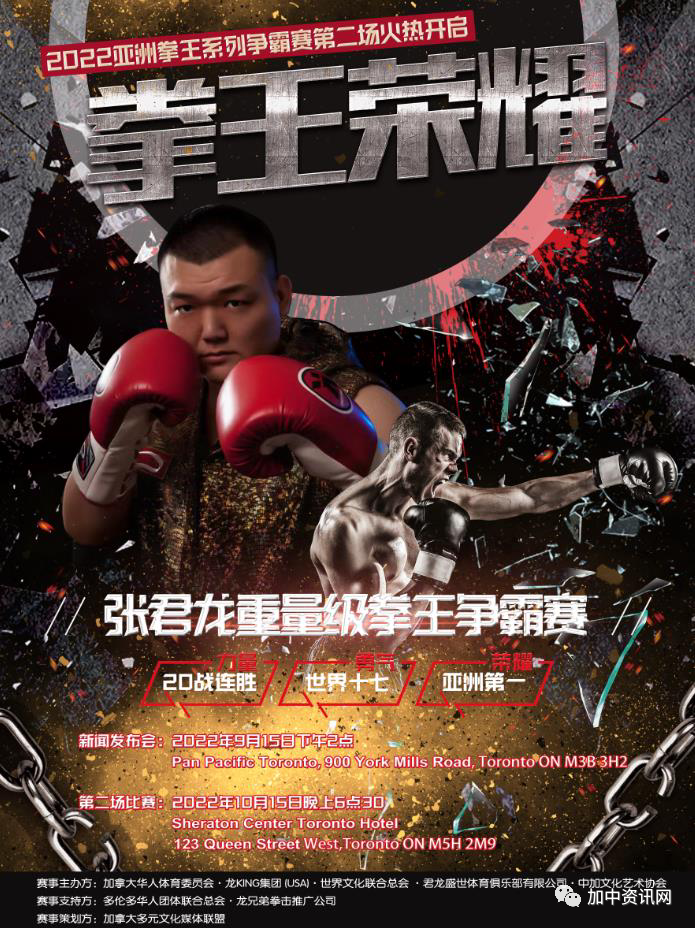 加拿大多元文化媒体联盟同时也是拳王张君龙第二场比赛的媒体支持方,欢迎有更多的人买票前去观看加油,欢迎商家赞助比赛。