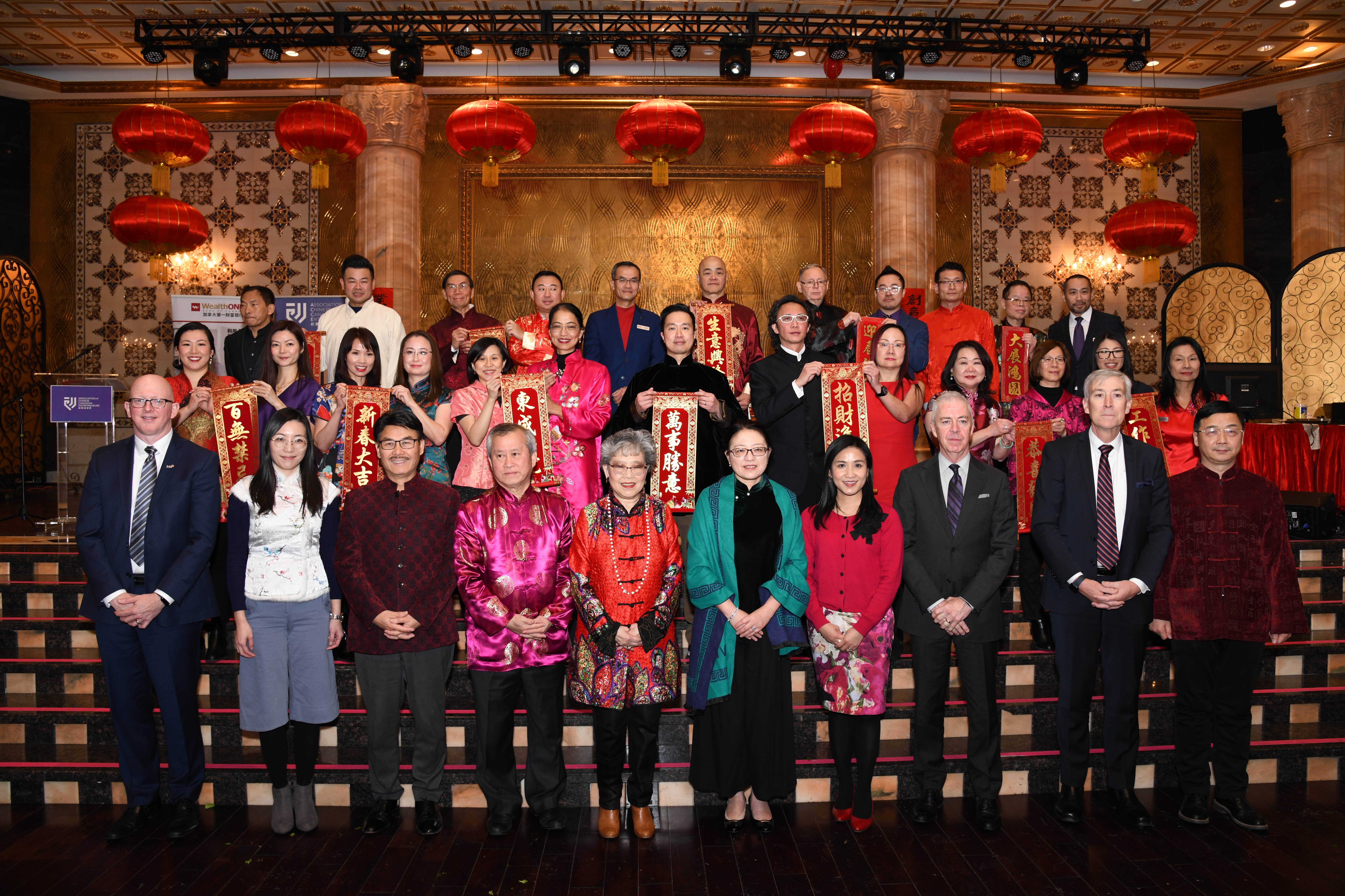 嘉賓及會董們合影。(前排左起):Randal Blackwood(BDC), 萬錦市市議員李思韻,萬錦市區域議員何胡景,萬錦市區域議員李國賢,MPP Daisy Wai,中國駐多倫多代理總領事洪紅、香港經貿處處長巫菀菁, Barry Ferguson(Wealth One Bank of Canada), David Agnew (Seneca College), 經濟商務參贊劉林林。(二排左起):馬姍瑚, 黃雅芝,張敏,田丹,陳嘉慧, 麥嘉慧, 會長歐陽浩東,勵文灝,鄔婷潔,譚貴瓊,羅淑儀,Karen Huynh, 蕭君慧。(三排左起):鄺國雄,陳柏堅,黎宏俊,王岩,周憲本,吳慶華,Alan Hamm, 林育臣,盧明傑,田頌源, 石家輝。