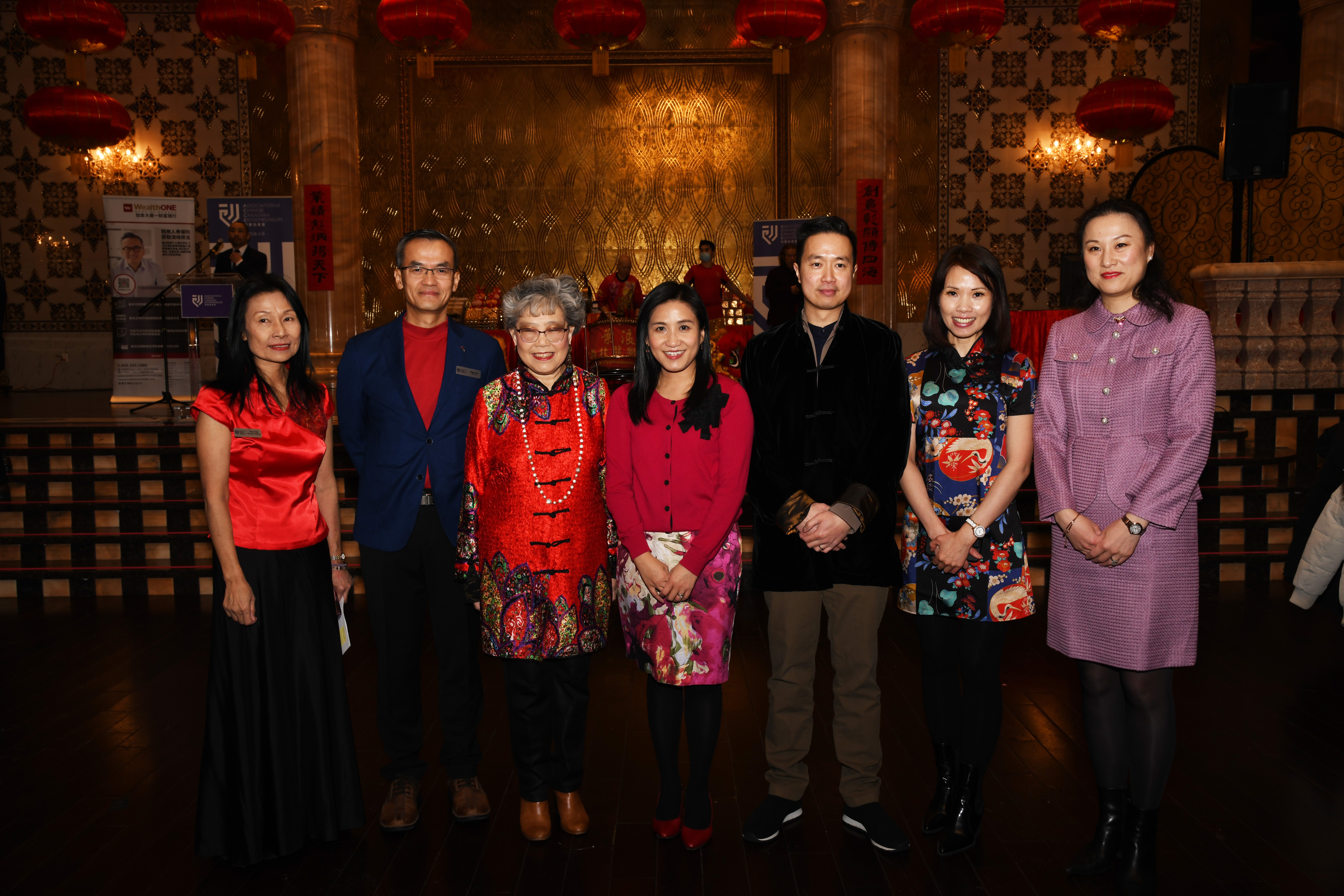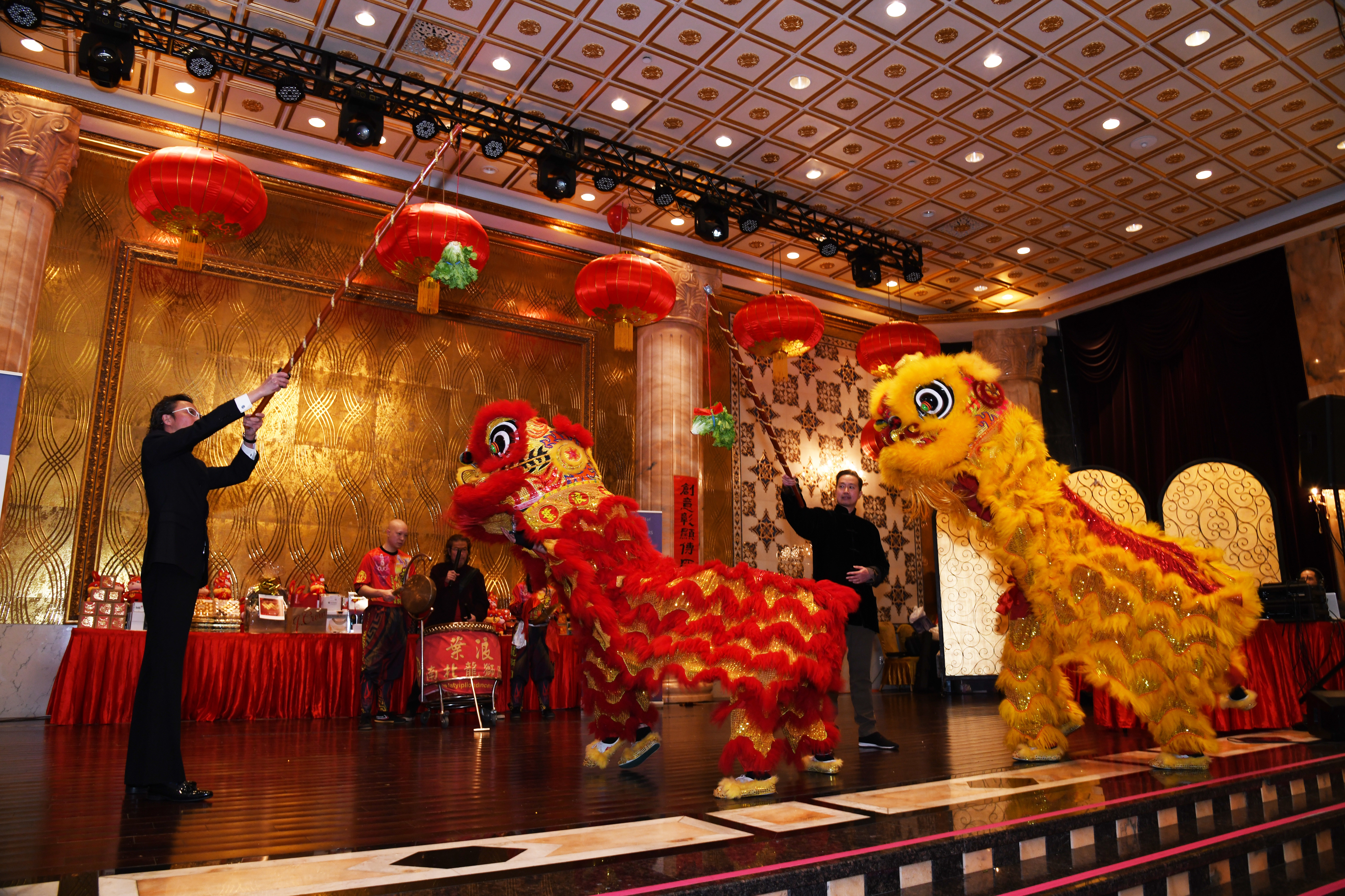 嘉賓為嘉賓為舞獅點睛。左起:MPP Daisy Wai, Randal Blackwood(BDC), 萬錦市區域議員李國賢,勵文灝,Barry Ferguson(Wealth One Bank of Canada),香港經貿處處長巫菀菁,會長歐陽浩東,萬錦市區域議員何胡景,中國駐多倫多代理總領事洪紅、, David Agnew (Seneca College)