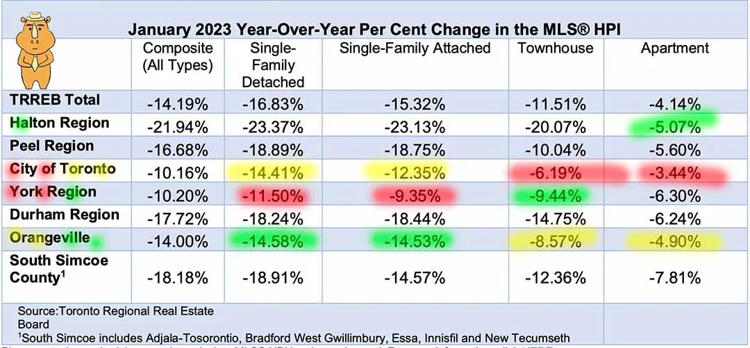 如果非要比较各种房型、各个地区的数据的话,多伦多市区和Orangeville的公寓勉强能看;独立屋和半独立屋在哪里都是重灾区。