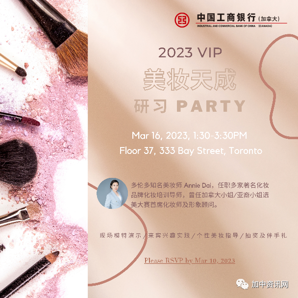 加中资讯网2023年3月23日讯 中国工商银行(加拿大)3月16日成功举办主题为“美妆天成研习Party”VIP活动,盛邀25位女性贵宾客户,与多伦多知名美妆师Annie Dai、工行两位女性高级行政副总裁一起,共贺三月全球女性主题节日。