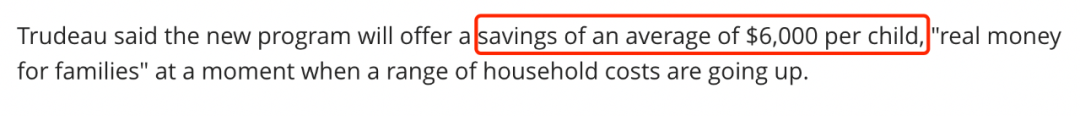特鲁多表示,新计划将为每个孩子每年平均节省$6,000,这是在一系列家庭成本上升之际“为家庭省下的真金白银”。