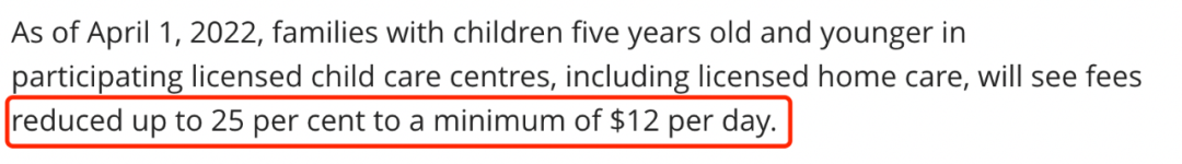 从2022年4月1日起,有5岁及以下儿童的家庭在参与的持证托儿所的费用将减少25%,最低为每天12元。