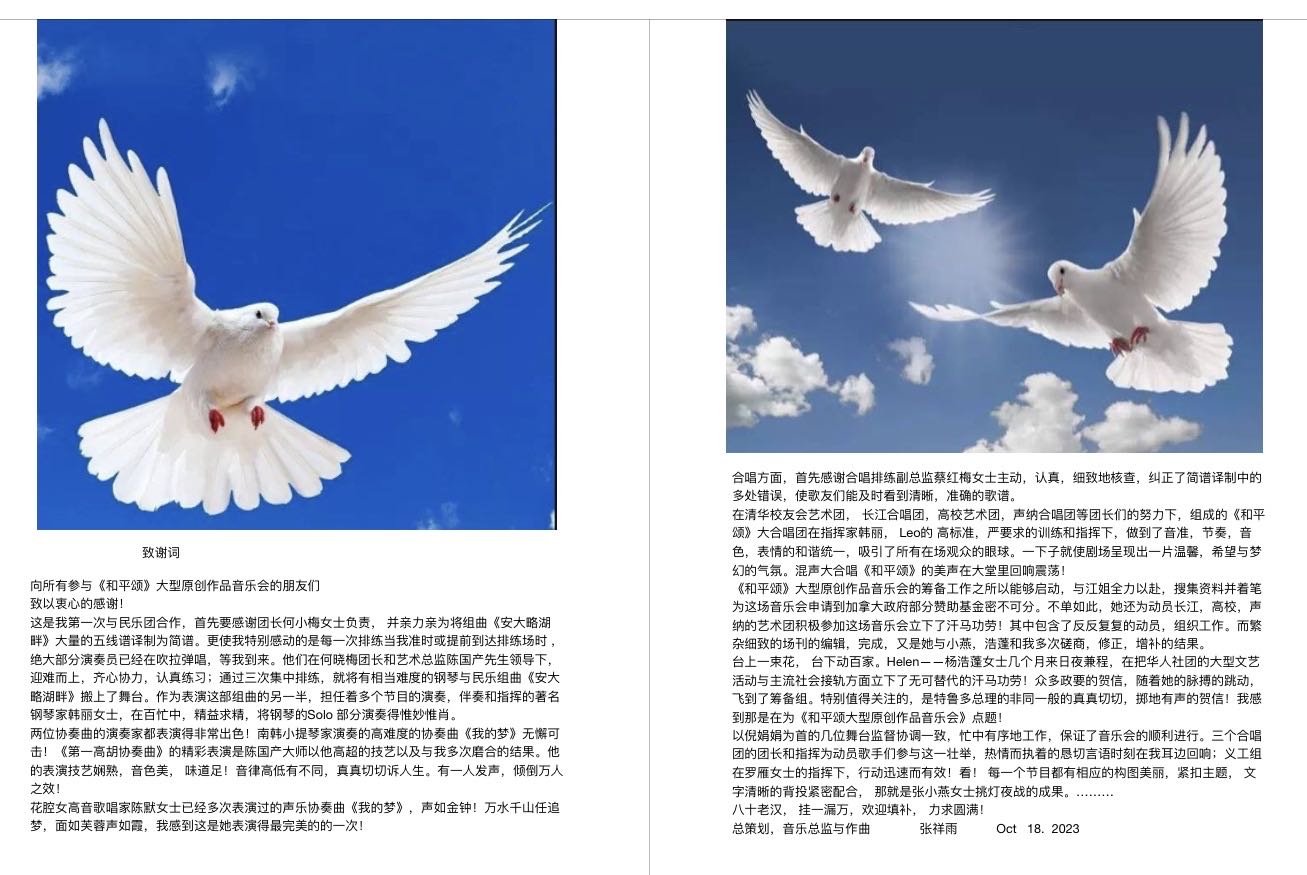 音乐会演奏了北美著名华裔作曲家张祥雨的多部原创作品,生动地呈现了生活在枫叶之国的各族裔人民和平安宁的幸福生活以及他们对世界和平的渴望。
