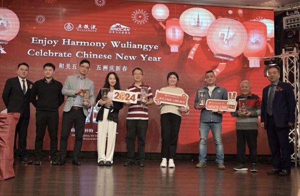 由加拿大汉嘉酒业有限公司提供的六瓶五粮液。温哥华河南联谊会的张江海副会长,加拿大河南同乡会青年会副会长张帝和汉嘉酒业代表(1人)上台抽奖