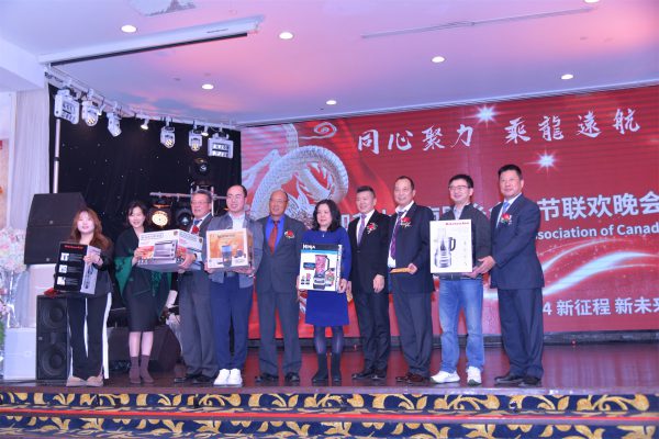由周大福金店提供的枫叶金币六枚,以及“风生水起”礼品三个。陈国治夫妇,河南同乡会会长焦振龙和温哥华河南同乡联谊会副会长张江海上台抽奖。