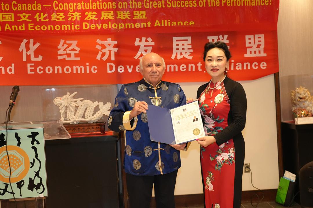 Sophia Lian代表加中文化经济发展联盟分别向安平老师和费佳老师颁发了"加中文化艺术交流非遗传𠄘贡献奖"。