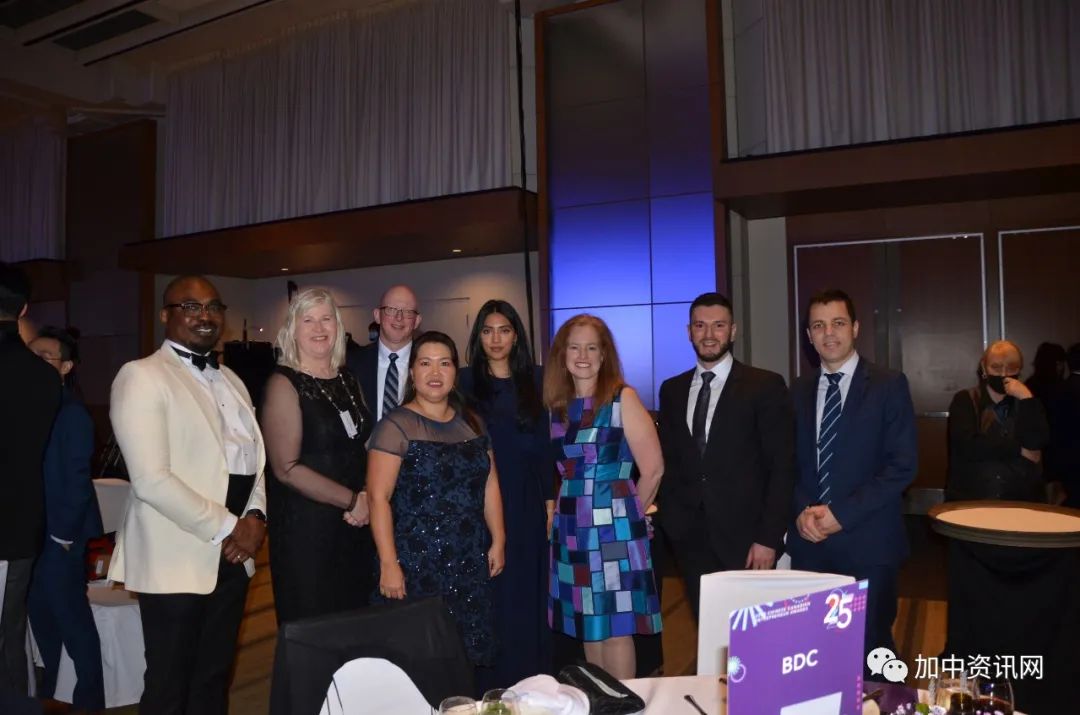 九個獎項得主與(左五)加拿大商業發展銀行BDC高級副總裁Paula Cruickshank及(左六)創業協進會會長歐陽浩東合照。(左起:最佳亞太貿易獎:Organika Health Products–秦偉仁;傑出青年創業獎:Jarvis Consulting Group–王立州;最佳企業創辦獎:Untether AI–席與宏;最佳企業家獎:Advanced Skyline Technology Ltd.– 范鋒;終身成就獎:Shim-Sutcliffe Architects - Brigitte Shim;最佳國際商業獎:Sinobec Group Inc.– 李中由牛珺代領; 最佳社區服務獎:Sante Circle Health–陳婉瑩;最佳企業進步獎 :Hastings Utilities Contracting Ltd. – 陸晨麒;最佳創意獎:Titan Haptics Inc.– 司徒正然)