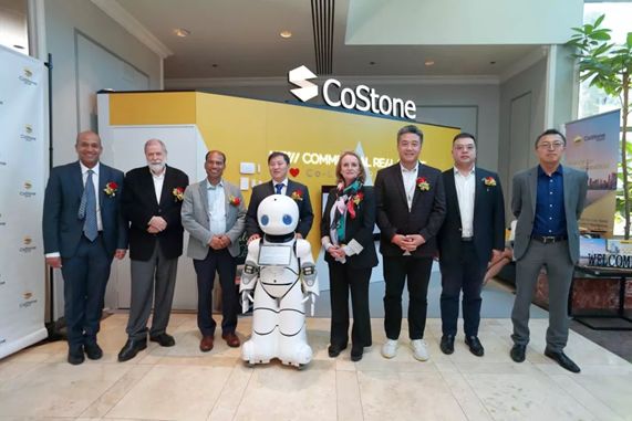 旺市议员Sandra Yeung Racco女士和列治文山市经济发展委员会主席、市议员陈志辉先生都饶有兴趣得和合石集团的第888号员工AI机器人优优进行互动,他们表示非常欢迎合石集团来旺市和列治文山市开发Co-Living青年公寓项目。