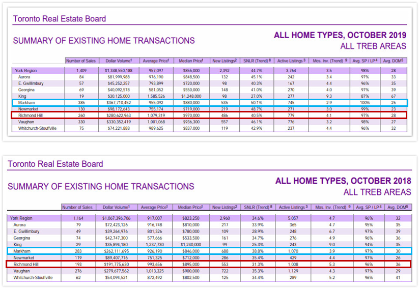 以上的两个表格分别为今年和去年10月万锦和列治文山的交易情况。两相比较,两地交易量年增幅近似,分别为36%(万锦)和35%(列治文山),而房价涨幅却差异较大,列治文山的均价年增9%, 而万锦则为3%。