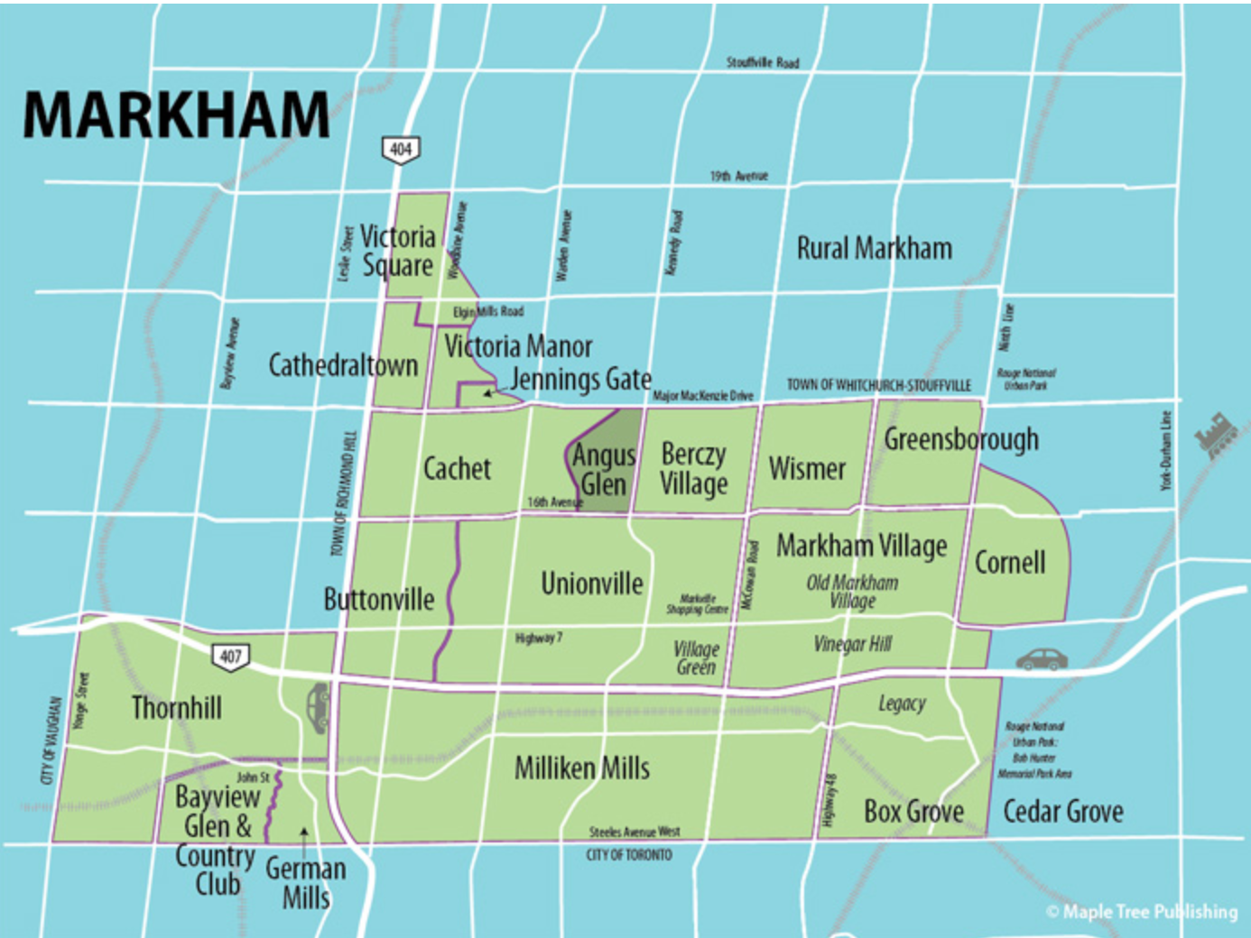 位於萬錦市東北方的Angus Glen,在Major Mackenzie以南,16街以北,Kennedy以西,Warden以東。Angus Glen小區分為東西兩個居住, East Village 和 West Village。整個小區環繞Angus Glen球場而建,是萬錦市目前高檔住宅比較集中的一個社區。