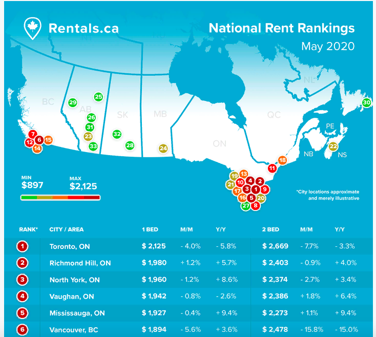根据Rentaldotca发布的5月出租市场报告:在过去一个月里,加拿大Apartment出租租金平均下降3.2%,Condo租金下降4.6%。具体城市方面:多伦多这个月one bedroom下降4%,two bedroom 下降7.7%。
