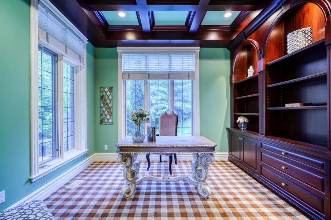 主人房对面就是办公室,欧式木质书柜配上木质的天花装饰,沉稳庄重。书房两面采光,窗明几净。主人卧房和办公室位于整个建筑南端的最尽头,因此空间相对独立,安静而私密。