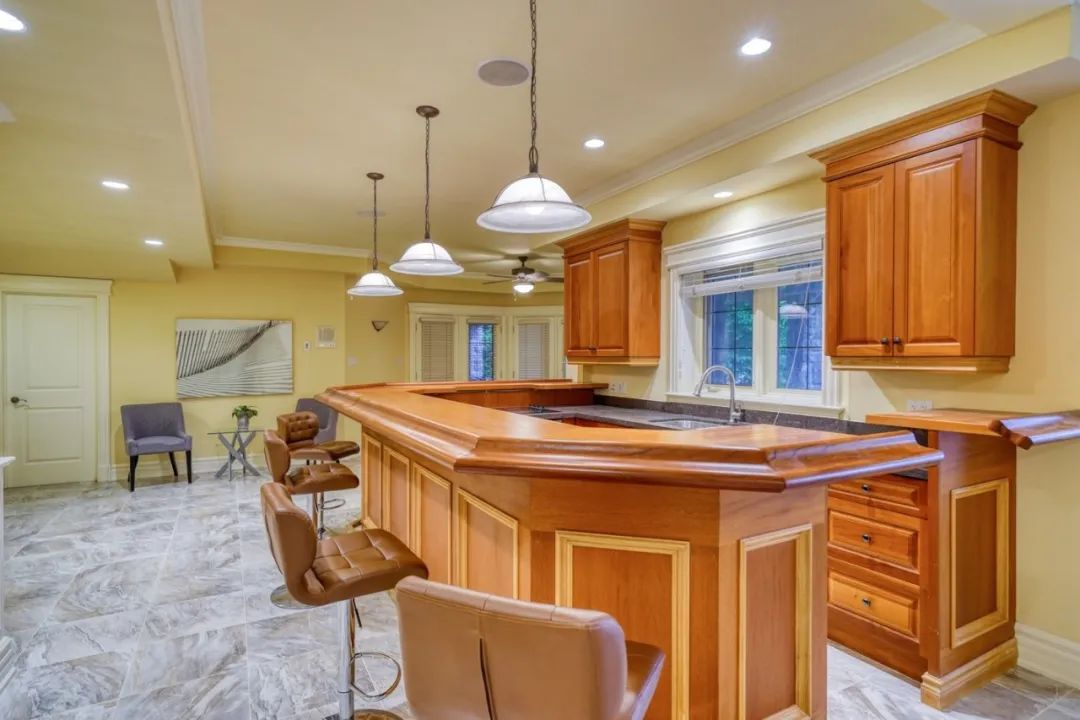在房屋的两端分别布有楼梯通往地下室,与其说是地下室,其实更应该看成是独立的一层居住空间,因为建筑地势的原因,整个地下室都在后花园地面以上。通过地下室的门,可以直接来到后花园。在地下室,1600尺没有任何间隔和柱子的空间感让视线开阔。地下室的超大玻璃门窗,让里面撒满阳光,可以满足任何超大Party或者生意场上的商务酒会。在这个走出式地下室的一侧,还配备了专门的吧台服务区和厨房,品一杯鸡尾酒,来一曲舞步,谈一桩生意,聊一段感情。你能想到的,她都能满足你。