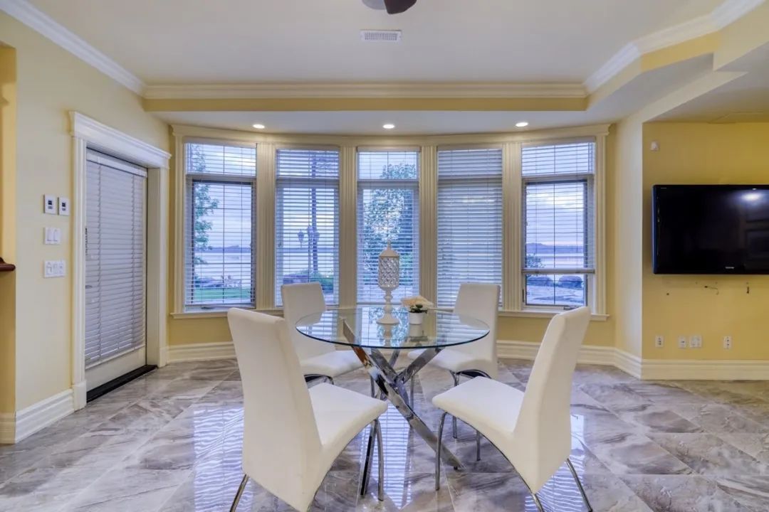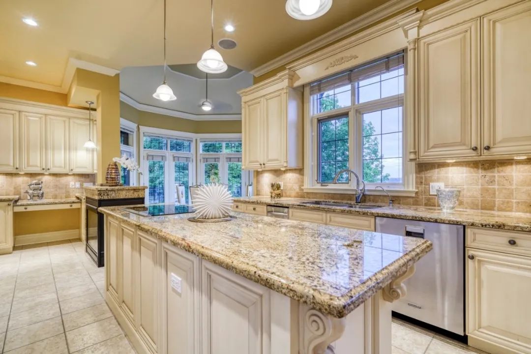 与气派大厅相连的就是厨房,简约大气的现代化装饰风格,细微中又流露出欧式情愫。厨房里的冰箱、微波炉、烤箱都是双套配置,厨房台面为典雅的大理石材质,宽大的中央岛,时尚亮丽的吊灯,升降式抽油烟机,超多的收纳柜。功能分明,线条流畅、时尚简洁的厨房,无论是居家还是朋友Party,都能得心应手。转角的早餐区,无论坐在哪个位置,都能欣赏到窗外不同季节的风景,或碧水蓝天,或满眼葱郁,美好的一天从这里开启。早餐区两侧都有门可以步入到户外的阳台,呼吸新鲜空气,聆听鸟儿晨鸣。