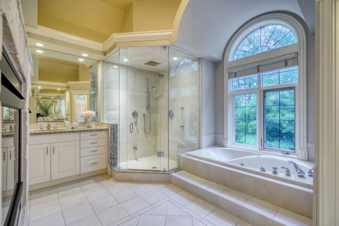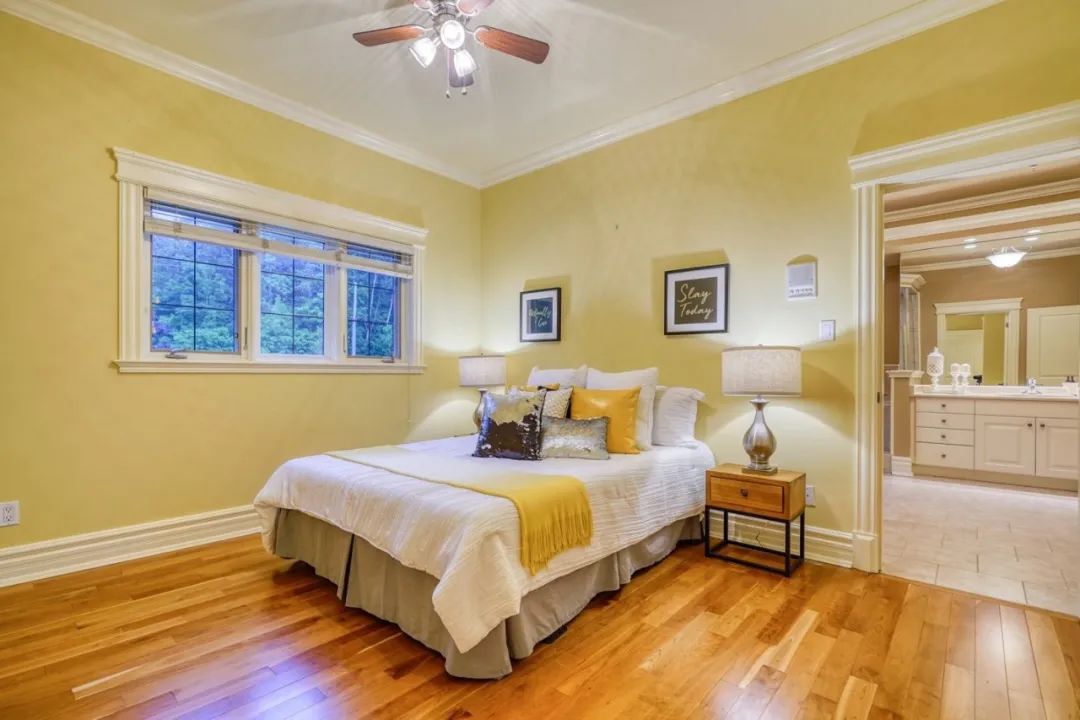 厨房另一侧,穿过走廊就是晚宴厅。宽大的空间既能满足朋友的到来,也能满足家人聚会的要求。人们常说酒逢知己千杯少,要是在这里,朋友相聚,畅聊人生,宁愿一醉方休啊!这栋湖边别墅共有4+1 间卧室,位于一楼的主人卧房,宽敞明亮的玻璃门窗让阳光洒满床头不再是梦想。房间里私人定制的原石壁炉既有美观装饰作用,也为冬日取暖提供额外的选择。主人卧房配备高端大气的独立卫生间和两个单独的超大衣帽储藏间。宽敞明亮的主卧卫生间,犹如皇家待遇的高贵和享受。精油的香气随着水汽氤氲,如梦如幻。放低一切,让忙碌的心灵得到轻松和释放。