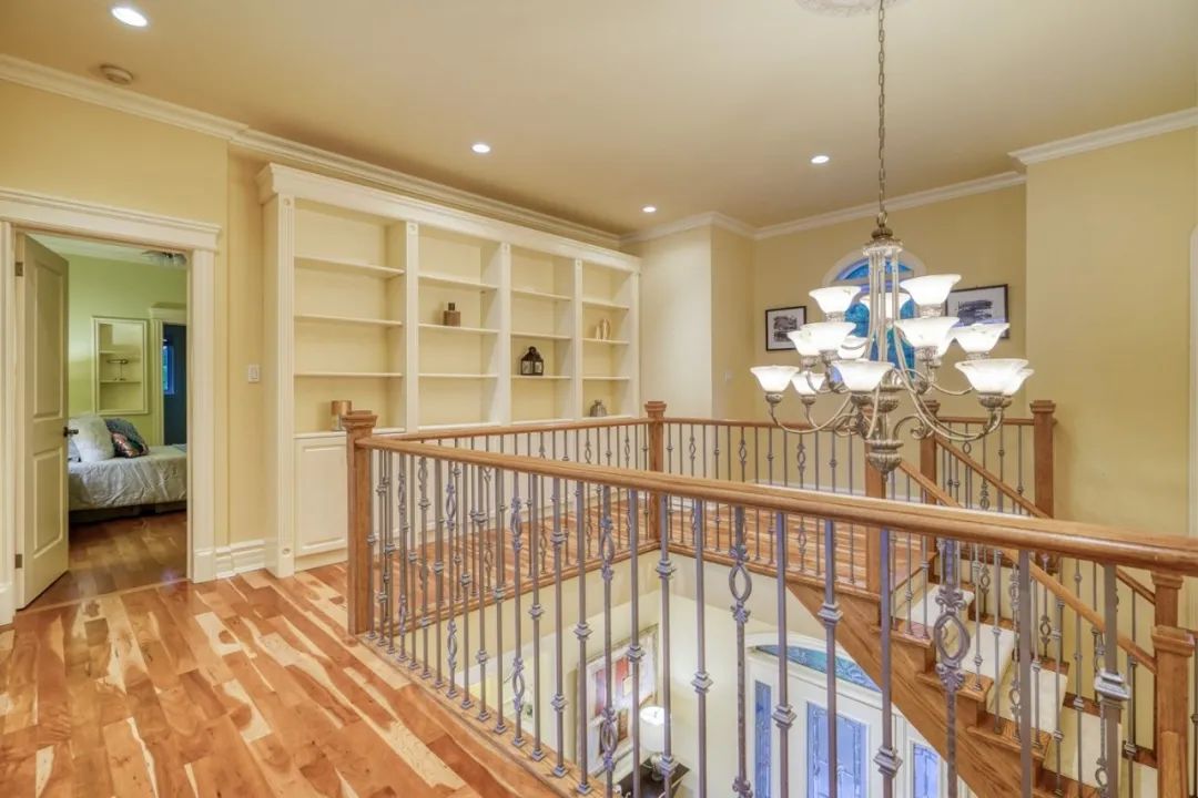 顺着雕花复古的楼梯来到二楼,楼上有三个卧房。南侧的卧室有自己独立的卫生间和书房,另一侧的两间卧室共享一个超大的卫生间。