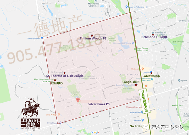 從該物業可步行到小學、St. Theresa of Lisieux高中,Twickenham公園與Elgin West社區中心,往西驅車4分鐘到達Yonge商業大街,沿街有Longo’s超市、Loblaws超市、No Frills超市等主流大型超市,Shoppers Drug Mart、銀行、醫療診所、Starbucks以及各類特色商鋪和家庭餐廳琳瑯滿目,滿足日常生活需求;驅車15分鐘以內直上3條高速公路——東面的Hwy404、西邊的Hwy400以及南邊的Hwy407,輕松到達城市各個角落。