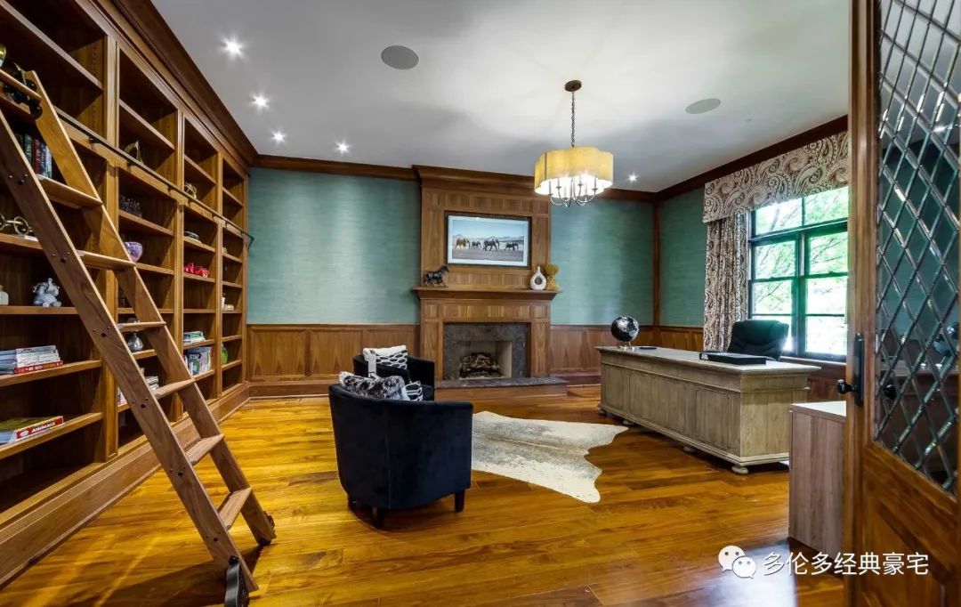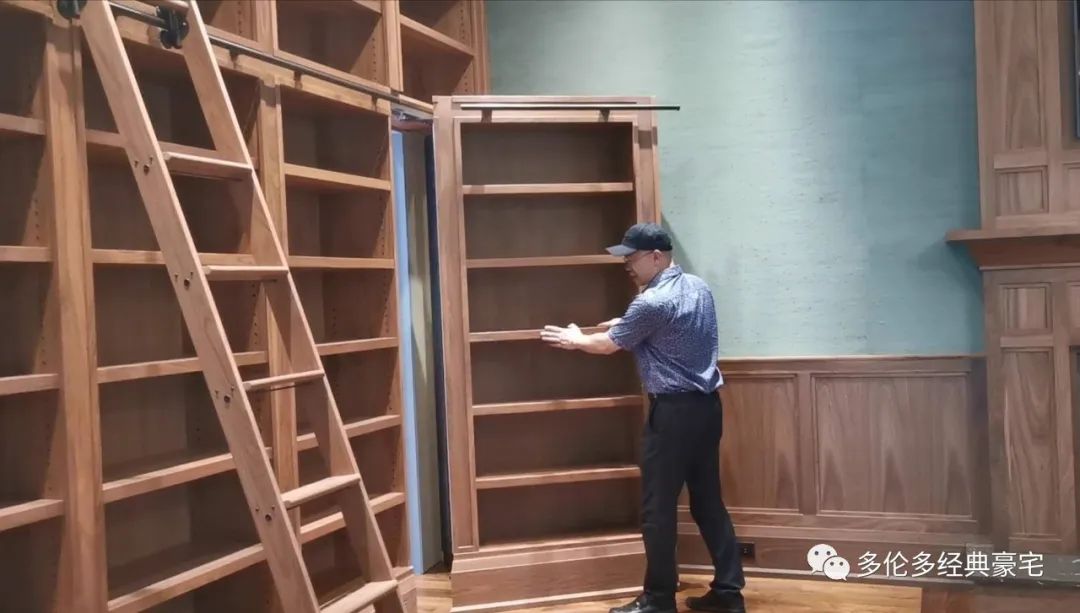 进门是一个高挑的门厅,右手边是一个宽大的书房,40平米,这一面墙的书柜太棒了,还有一个梯子方便取书,这个书柜还有一个机关,可以打开成一道门,从这儿进入另一个房间。