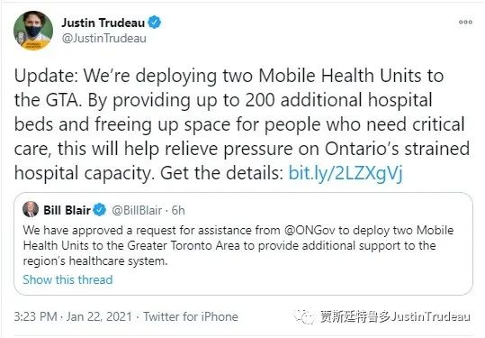 1月22日,联邦公共安全和应急准备部长比尔•布莱尔(Bill Blair)阁下、加拿大公共服务和采购部长阿妮塔•阿南德(Anita Anand)阁下以及卫生部长帕蒂•海度(Patty Hajdu)阁下确认,加拿大联邦政府将向安大略省派出两个联邦移动医疗站(Mobile Health Units, MHU)到安大略省。