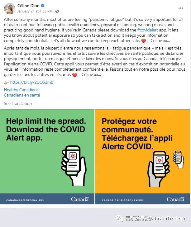 “Near, far, wherever you are”(无论远近亦或身处何方)(在加拿大🇨🇦), #COVIDAlert# 都会有所帮助,通知您可能近距曝露于COVID-19接触。如果您的病毒检测结果为阳性,请记住使用给您的一次性密钥,以帮助守护您社区的安全。谢谢,#席琳·迪翁#